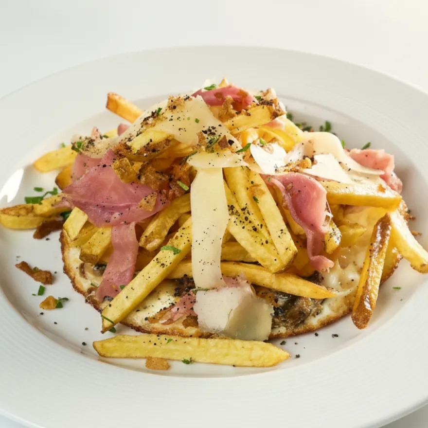 Ovos, presunto e batata frita